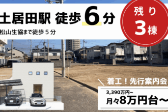 建物完成しました!内覧予約受付中! 【2区画】余土小学校・余土中学校校区!国道56号線より南に200m。 徒歩10分圏内に、スーパーやコンビニ、公園があり、小さなお子様がいるご家庭にもオススメの立地。伊予鉄バス「和泉北バス停」まで徒歩6分。 ◆新規分譲地内の1区画、南西角地で日当たりや開放感があります。2台の駐車が可能! ◆和室を合わせると20帖のLDK。4帖のファミリークローゼット付♪