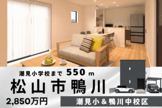 令和8年7月完成予定【限定1区画】潮見小学校・鴨川中学校校区!潮見小学校まで徒歩7分と通学も安心の距離。伊予鉄バス「潮見保育園前バス停」まで徒歩4分 ◆外部収納や階段下収納など、各所に収納のある嬉しい間取り ◆ゆったりとした広さのポーチは、雨の日も安心! ◆室内物干しスペースや食洗機、タッチキー付玄関ドア、リビングエアコン標準装備!