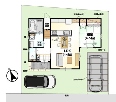 INTERIOR●帰宅後すぐに洗面所・浴室に行けるので、衛生的で家事効率も良い●和室と合わせて約18帖あるゆったりとしたLDK●1階に和室があるので、将来1階を中心とした生活も可能です●屋根付きのバルコニーは、雨の日も安心●各所に収納を設置。階段下を利用した外部収納もあります。