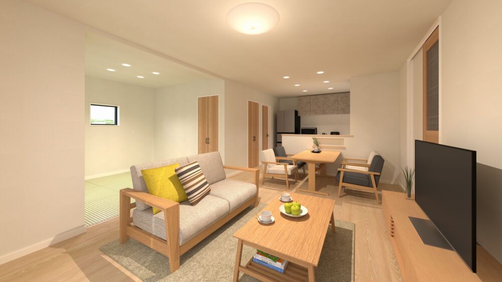 INTERIOR●和室と合わせて20.5帖あるゆったりとしたLDK●キッチンパントリー付きで見栄えもスッキリ●生活動線を考え、2階に上がってすぐにバルコニーへ出入りできるようにしました。●ウォークインクローゼットは3帖あるので、物が増えてもしっかりしまうことが出来ます!