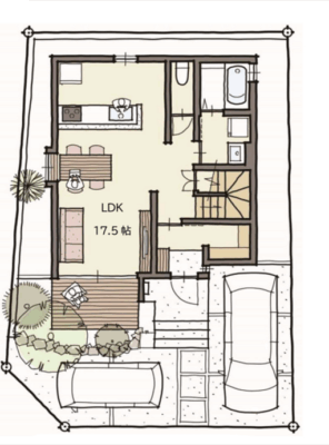 ● 17.5帖のLDKはダイニングとリビングがゆるやかにつながる設計