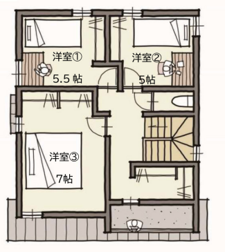 ● 2階には5帖〜7帖の洋室が3部屋。子ども部屋・主寝室・書斎にも