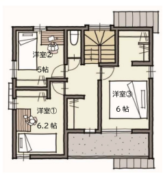 ● 2階には5帖・6帖・6.2帖の洋室で、家族のライフスタイルに対応