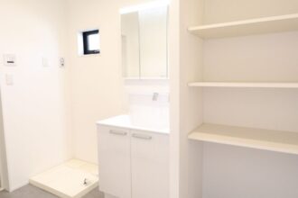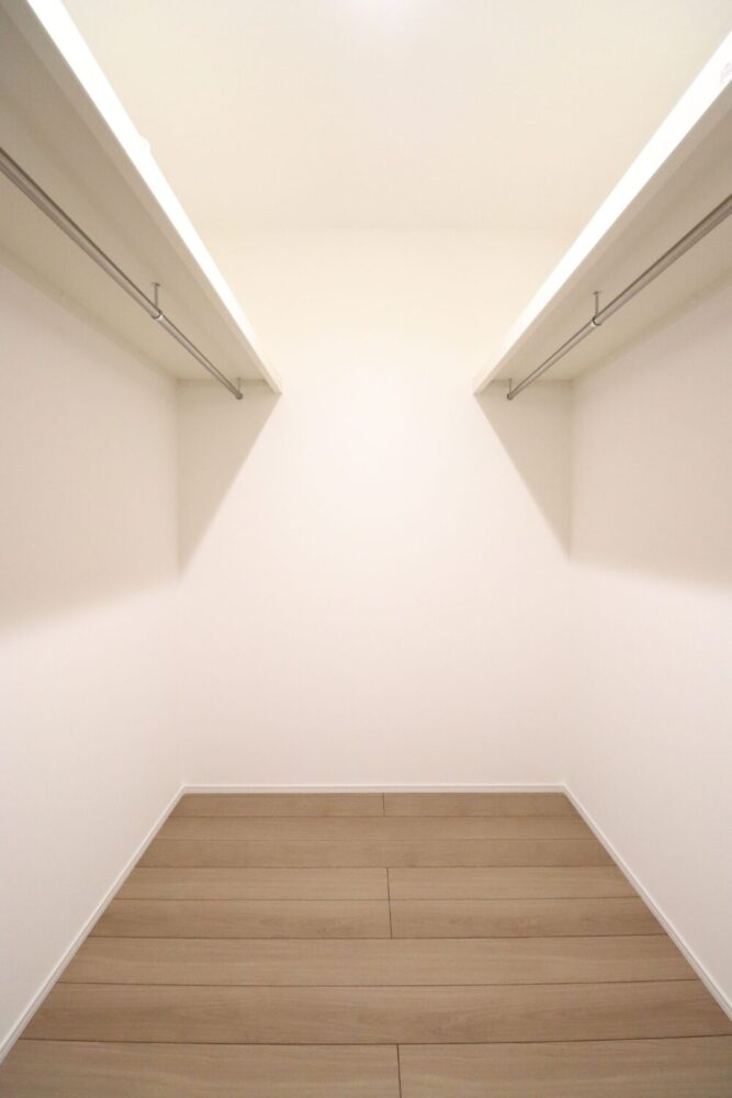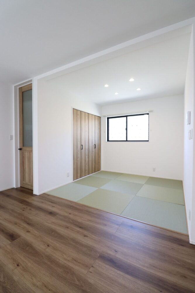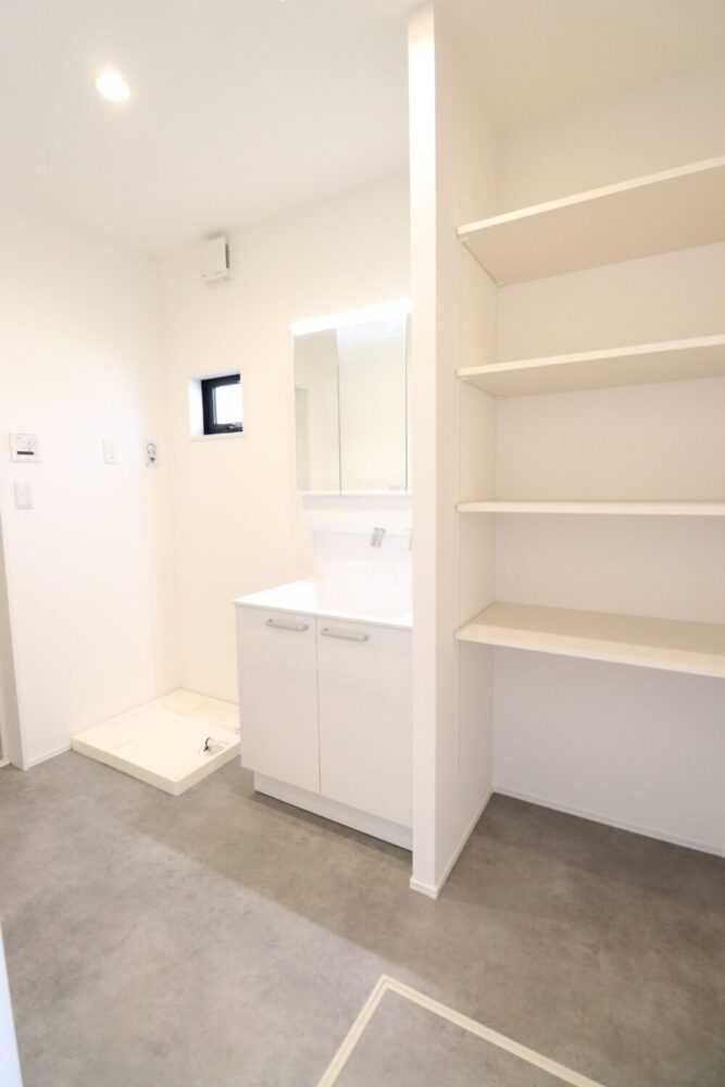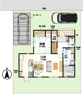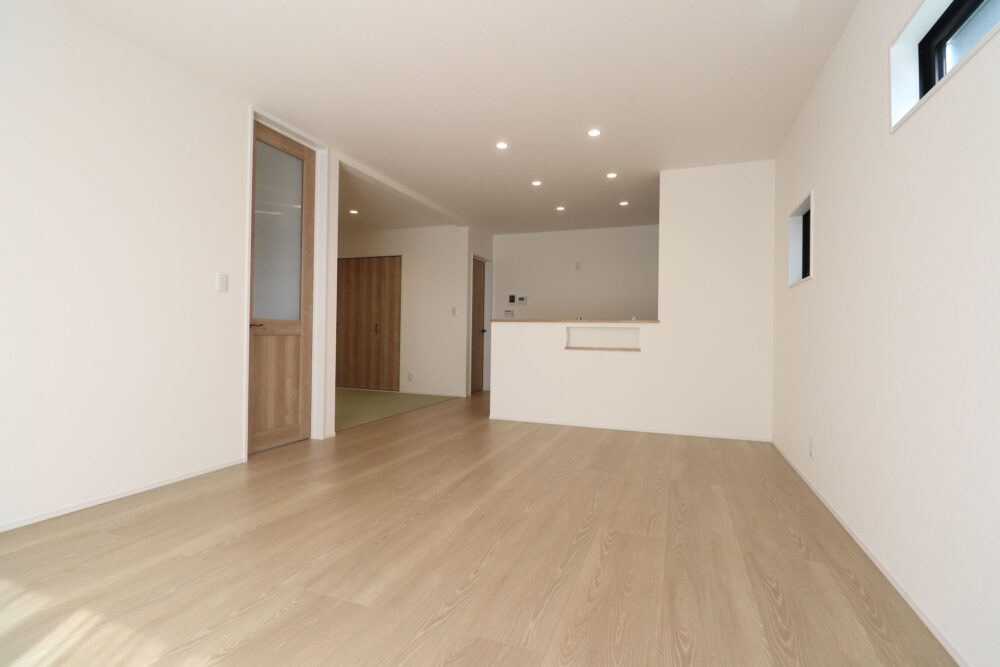 INTERIOR●15帖LDK+4.5帖和室のゆったりとした1階●階段下を利用した土間収納付●3帖の洗面脱衣室は室内物干しがついており、雨の日のお洗濯も安心●衣替えもスムーズにできるファミリークローゼット。洋服以外の物もたくさん収納できる広さ●日当たりの良いバルコニー