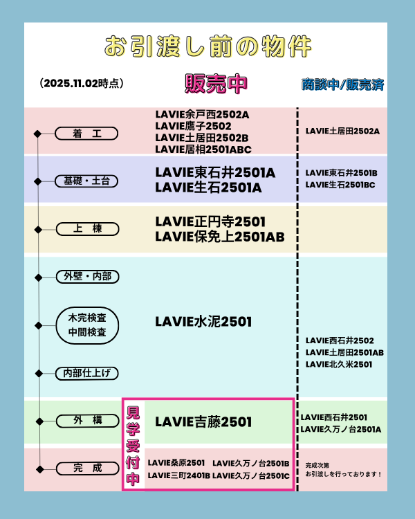2025年11月2日 【11/2時点】しあわせ住まい松山建売住宅!建築&商談中&ご成約状況 現在、建築中の物件と販売中の物件をまとめております。お家探しのご参考にぜひご覧ください! ●春からマイホームで新生活🌸 2026年3月までに完成予定の物件をご紹介中! 詳しくはこちら>>> 完成前でも類似物件のご見学&住宅ローンのご相談は受付中です!お気軽にお問合せください!