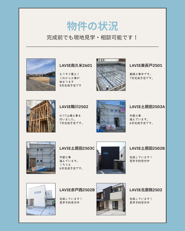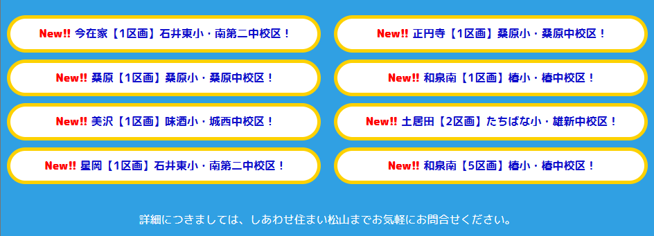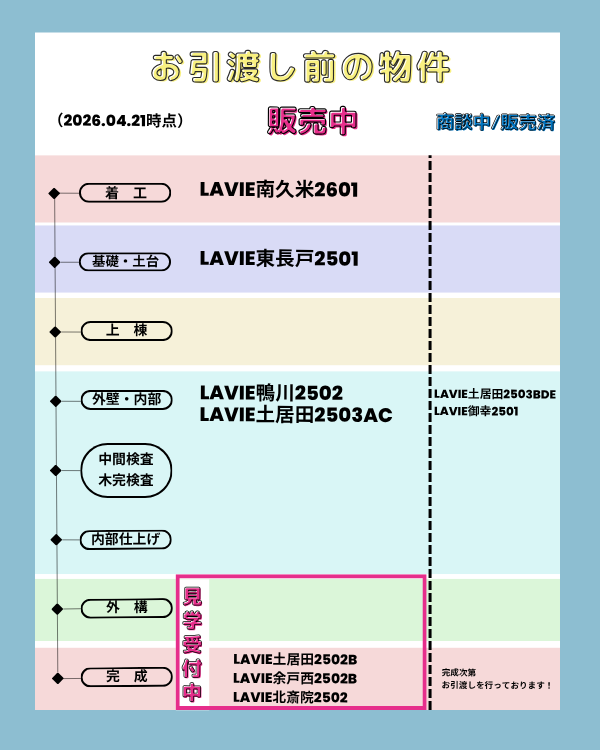 2026年4月21日 【4/21時点】しあわせ住まい松山建売住宅!建築&商談中&ご成約状況 現在、建築中の物件と販売中の物件をまとめております。お家探しのご参考にぜひご覧ください! 先取情報の段階でのお問合せも増えています! ご来店いただくことで、詳しいご説明をさせていただいております。まずはお気軽にお問い合わせください。 \webでカンタン建売は未完成でも売れてます/ 先取物件を問い合わせる>>